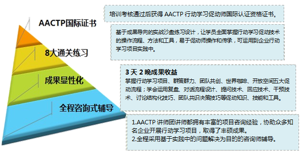 aactp国际注册行动学习促动师认证,融合众多企业咨询实战经验,为广大企业领导者指引一条罗马大道,手把手教您行动学习促动技术,促发团队内生智慧,在企业全球化的进程做到真正的与国际接轨!