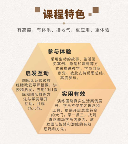 《天赋领导力》是由普伟集团滕政云导师投身十余载、精心设计打造的体验式成长课程。通过体验式、互动式的教学和演练,支持领导者自我觉察;运用核心教练能力和实用教练方法,更好的与团队展开互动;深层次提升意愿和动力,激发热情和创造力,唤起个人和团队的内在驱动力和承诺度,从而激发组织智慧和潜能,取得事半功倍的效果。